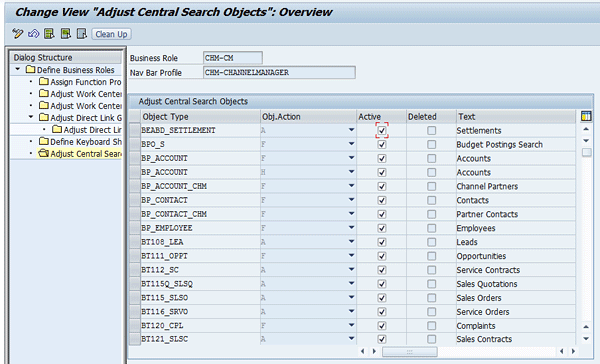 You can deactivate the search objects for the business role/navigation bar profile by de-selecting the check boxes in the Active column if needed. Based on this concept you can influence the search objects that are available in the Web UI for different business roles.