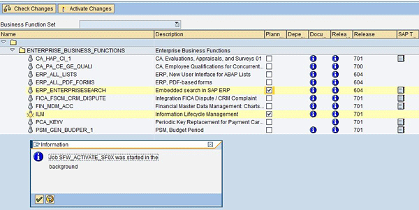 To activate this object, go to the Switch Framework Customizing screen using transaction code SFW5. Look for ERP_ENTERPRISESEARCH in the ENTERPRISE_BUSINESS_FUNCTIONS section. Check the selection box in the Plann… [Planned status] column and click the Activate Changes button (Figure 5).