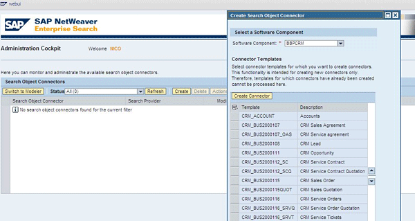 Log on to the SAP CRM WebClient UI with the SAP user who has the Embedded Search Admin role assigned to his or her user profile (see Step 2 for how to assign this role). Click the Create button, and the search connector creation dialog pops up. Select the software component BBPCRM and select the relevant search connector. Click the Create Connector button. A waiting icon appears for a few seconds, and then you are returned to the cockpit screen. If the creation of the search connector has been successful, the search connector is visible in the screen.