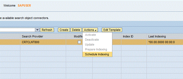 Step 8. Create TREX indexes for each activated search object connector. Now that the search connectors of your choice have been activated, you probably want to use them. In this step you build the indexes for the first time. Select the search connector you just created in the Administration Cockpit by selecting the row of the relevant search object and clicking the Actions button. In the menu that appears, select the Schedule Indexing option.