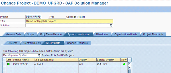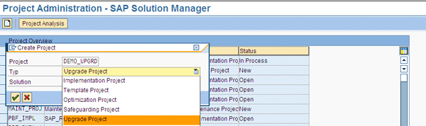 You create the project in SAP Solution Manager in this phase. Use transaction SOLAR_PROJECT_ADMIN to create an upgrade project (Figure 1). There are two ways of creating this project: either from a copy of an existing implementation project or as a new upgrade project. In this example, I’ve created an upgrade project without any reference to an earlier project by selecting Upgrade Project from the Typ drop-down list. This is based on the assumption that SAP Solution Manager was not used during the earlier implementation project; if it was used you would select the copy option from the Project menu.