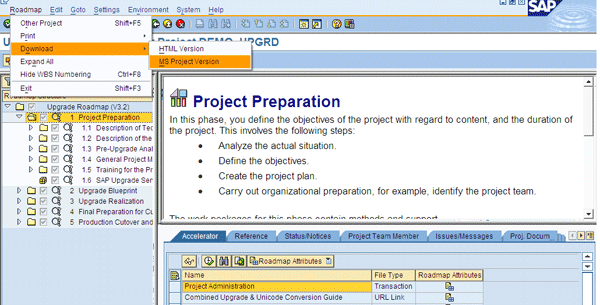 Clicking any activity in Figure 9 opens the detailed activity view of the upgrade roadmap. You can download the upgrade roadmap activities by following menu path Roadmap > Download > MS Project Version (Figure 10). You can use this Microsoft Project for the rest of the project management-related activities. It can be linked in project documentation back in the roadmap under the Proj. Docum… tab.