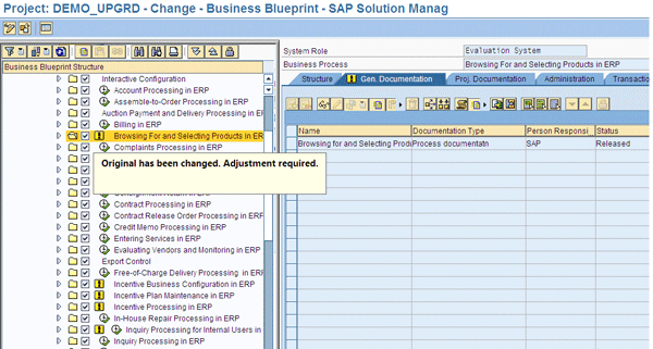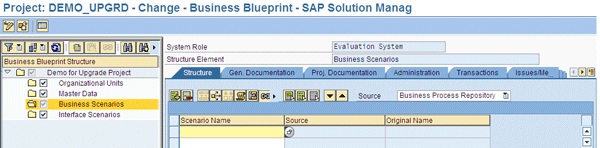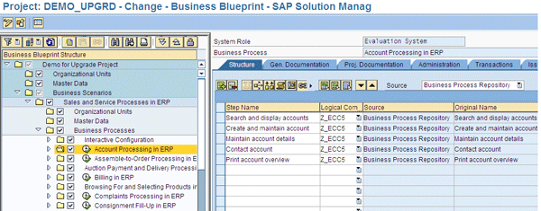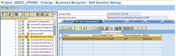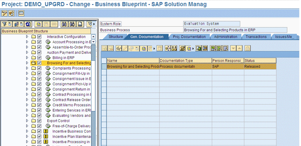 BPR automatically populates data in different tabs such as Proj. Documentation and Transactions. Save the business blueprint of the upgrade project (Figure 16).