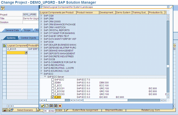 After this, the non-production system undergoes a technical upgrade. Create and connect this upgraded system logical component back in the SAP Solution Manager project. Use transaction SOLAR_PROJECT_ADMIN and connect the logical component in the System Landscape tab with the steps mentioned in phase 1 in this article (Figures 3 and 4). To do this, go to the Systems subtab and add the Logical Component of the newly upgraded system from the F4 help (Figure 17). Note that the older system’s logical components already exist in the project.