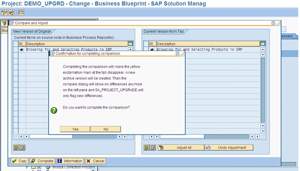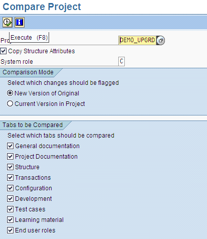 Now it’s time to run a comparison in SAP Solution Manager to provide all the differences between the older and newer versions. In this case, it would be the difference between SAP ECC 5.0 and SAP ECC 6.0. Use transaction SA_PROJECT_UPGRADE for the comparison of this project (Figure 21).