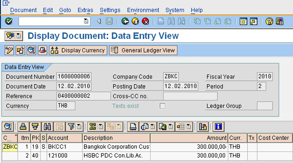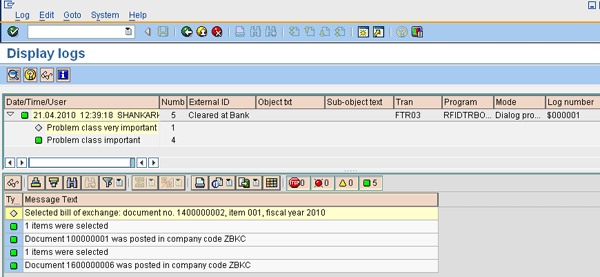 The system creates two accounting documents. The first document (no. 100000001) debits the check amount to the main bank account and clears the collection account (Figure 12). The second accounting document (no. 1600000006) reverses the contingent liability from the bank subaccount and clears the special general ledger open item from the customer account (Figure 13). You can also view the job log in Figure 14 by going to List > System Messages in Figure 11.