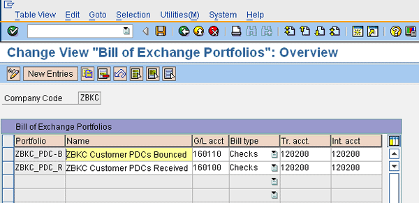 A portfolio is a collection or group of checks. Storing checks in portfolios makes it easier to manage. In the SAP system, you enter the details for checks when received and process them when they become due. Portfolios are defined for a company code in the customization based on the requirement. (Refer to the IMG step 4 in the configuration section of this article.) For this example, I have defined two portfolios, one for posting the receipt of post-dated checks (ZBKC_PDC_R) and the other to capture the details for bounced or returned checks (ZBKC_PDC-B). Based on your requirements and reporting, you can configure different portfolios. You need to define the special general ledger indicators separately for each portfolio and assign the alternative reconciliation accounts.