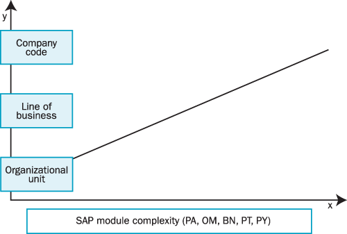 Figure 1 shows how the complexity of your mergers and acquisitions project increases with a more complex organizational structure or more HR submodules. Now I will go into more detail about how to analyze your HR system. This analysis serves as the foundation for a typical SAP HR implementation, and therefore it is crucial to a successful go-live. I’ll use a module-based approach to help you understand the migration phase and issues surrounding the migration process.