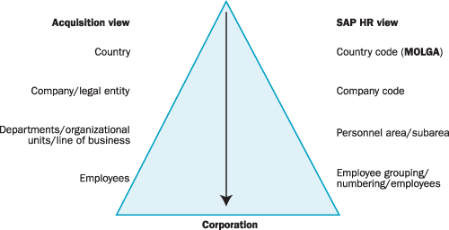 Figure 2 shows a top-down approach of how SAP software relates to a company’s structure. The left side lists the corporation view from the acquisition perspective while the right side shows an SAP HR structure perspective. Figure 2 includes the elements of SAP employee-related structures that you may need to address.