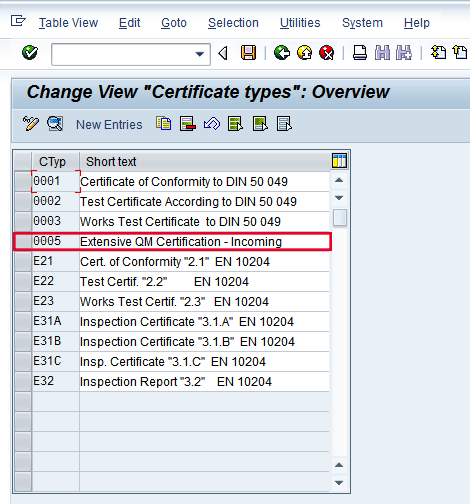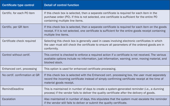 A certificate type is assigned in the material master data and is used as a further control function for incoming quality certificates. To define the control function of a specific certificate type, follow menu path SPRO > Reference IMG > Quality Management > QM in Logistics > QM in Procurement > Define Keys for Certificate Processing (Figure 3). Double-click Define Certificate Types.