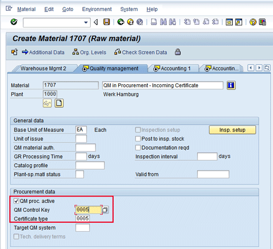 You should start by setting up the QM master data needed for an incoming certificate in SAP ERP prior to commencing the procurement process. The required master data is: