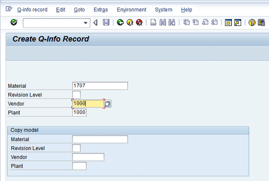 Because you selected the QM proc. active check box in Figure 6, you are required to define a relationship between a material and the vendor as a part of the QM master data, as I stated earlier. To create a Q-Info record, use transaction code QI01 or follow menu path Logistics > Quality Management > Quality Planning > Logistics Master Data > Quality Info Record: Procurement > Create. Figure 7 is the initial screen for the creation of Q-Info record in which you can define the material, vendor, and plant. After you populate these three fields, press Enter.