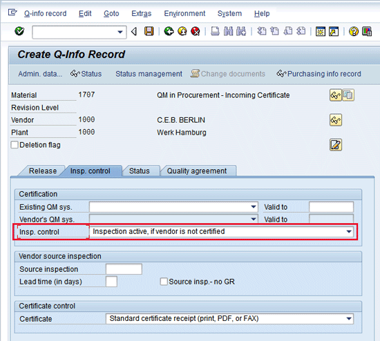 In the next screen click the Insp. Control tab (Figure 8). You must select the option Inspection active, if vendor is not certified, which ensures that the incoming certificate is checked for the relevant material (e.g., 1707) purchased from the vendor (1000). Click the save icon to save the Q-info record.