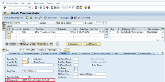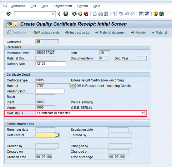 For example, with EDI, you can directly transmit and transfer the quality parameters of a vendor-delivered product noted on an incoming quality certificate into your SAP ERP system. If your organization has already integrated procurement processes with the QM module, you can build incoming quality certificates on these processes.