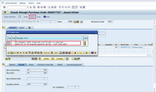 To ensure that all information is complete on the goods receipt screen, click the Check button. A pop-up box appears to inform you that a category 0005 inspected certificate is required. This is a warning message that you configured by selecting W Warning from the list of options in the pull-down menu for the Control without certif. control (refer back to Figure 5). You can now confirm this warning by pressing Enter again to save the document. Had you defined this as an error message in Figure 5, the system would not allow you to proceed until the incoming certificate was entered in SAP ERP.