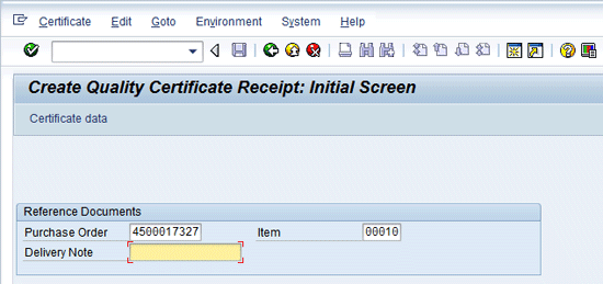 Next, create an incoming inspection certificate by entering transaction code QC51 or following menu path Logistics > Quality Management > Quality Certificates > Incoming > Create. In, the screen that appears enter the PO number followed by the item number of the PO and press Enter (Figure 11).