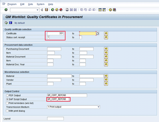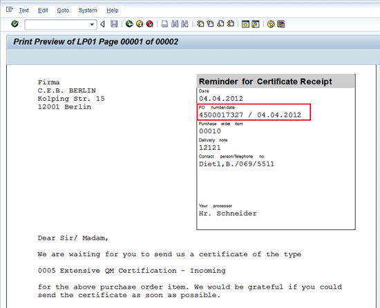 To track which expected or missing incoming certificates you need to follow up on with vendors, SAP ERP provides the intuitive capability to send reminders in the form of email, Adobe Acrobat documents, or simply by mail.