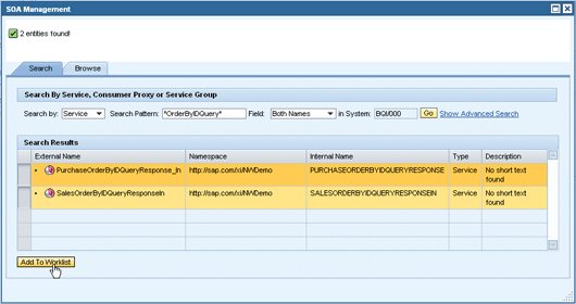 The search may result in a list with more than one service, and you can select several services from that result list using the control key. Click the Add to Worklist button to add the services selected in the search window to the worklist of the business scenario (Figure 10). Keep in mind that even with only one service in the search result list, you have to select that service before you click the Add To Worklist button. Otherwise, the search window closes without adding the service to the scenario. In my example, the SAP NetWeaver Demo Model service names do not have any patterns in common, so I have to open the search window several times.
