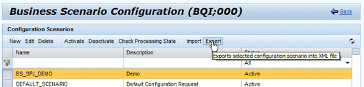 You can import and export business scenarios. When clicking the Export button in the business scenario’s overview screen (Figure 14), you can decide on whether or not to export all assignments to profiles and system connections with the business scenario. You can use this option as a backup for that configuration object. This way you can re-import the business scenario with all assignments to the same system to restore the state in case problems occur. An export without these assignments may be useful to transport the business scenario to other systems (e.g., from development to production) in which the assignments have to be newly created, or for documentation purposes.