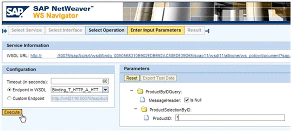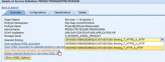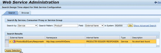 After you create the endpoints, profiles, and business scenario, test an endpoint with the Web Service Navigator (WS Navigator), if it has been configured beforehand (see the sidebar on generic configuration tasks). Find the endpoints in the Service Administration tab by clicking the Single Service Configuration link. The search pattern Product* lists the service ProductByIDQueryResponseIn (Figure 15). Select it and click the Apply Selection button.