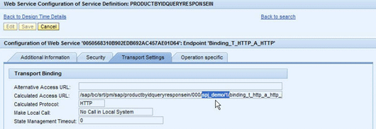 Select the second endpoint Binding_T_HTTP_A_HTTP to view its settings. Click the Transport Settings tab to view the Calculated Access URL (Figure 18). The profile’s name and version are part of the URL.