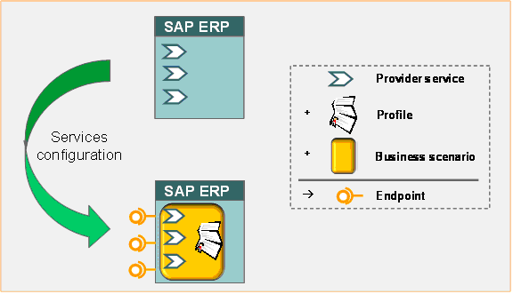To make an enterprise service accessible for a call from a remote system, you must configure an endpoint, which determines the functionality’s runtime behavior (e.g., security settings). The goal is to generate endpoints for multiple provider services. For this task you have to create two configuration objects: a profile and a business scenario.