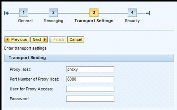 In step 3, you set up the transport settings, in which you specify the proxy parameters (Figure 7). In this case, the term “proxy parameters” relates to the network proxy, and not any consumer proxy. Click the Next button to proceed to step 4.
