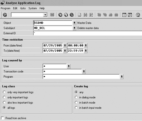 To make sure that the program executed correctly, open Application Log (transaction SLG1) and enter the following: