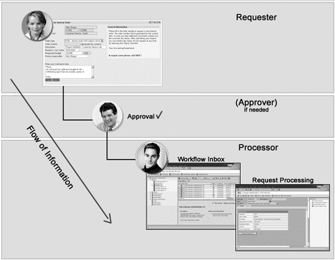 Data flow and process flow from sender via approver to processor