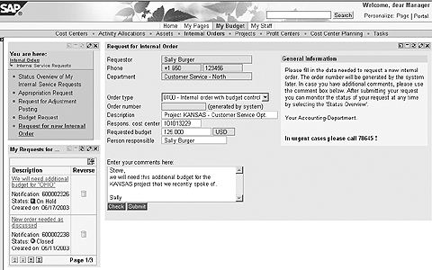 Let’s assume Sally’s boss, Steve, has asked her to carry out a special project. She needs additional budget to do so. This budget should be available on an internal order. Sally accesses an ISR Web form called “Request for New Internal Order” in her portal. She fills in the data and submits the form. The request is forwarded to her boss via workflow. Steve approves the request and it is routed to Charlie’s workflow inbox. Charlie processes the request for a new order. He has all information at hand to do so. (See Figure 1 for an overview.)