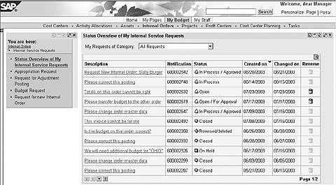 At any time, Sally can take a look at the status of her requests. She chooses Status Overview of My Service Requests from her portal and sees a list of all her requests (Figure 3). Her request for the internal order shows the status In Process/ Approved. She notices that other requests have already been processed and closed or are still open for approval. Sally could decide to reverse any of her requests that have not yet been processed, display the request’s form to review details, or even change data on forms that have not been processed or approved.