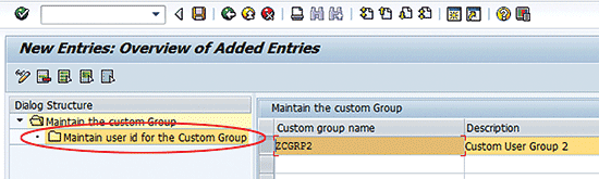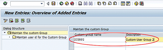 In the next screen enter the name of your custom group and a description. In my example I entered ZCGRP2 and Custom User Group 2 (Figure 12).