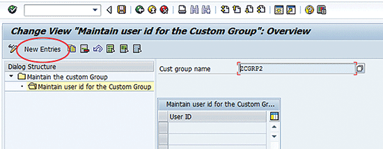 Custom user groups can be maintained in customizing by following menu path SPRO > SAP Reference IMG > SAP Customizing Implementation Guide > Governance, Risk and Compliance > Access Control > Maintain Custom User Group (Figure 11). Notice that the custom user group that you created in NWBC is visible here. This allows you to make changes to the description and the assigned users. To create a new entry in the custom group table, click the New Entries button.