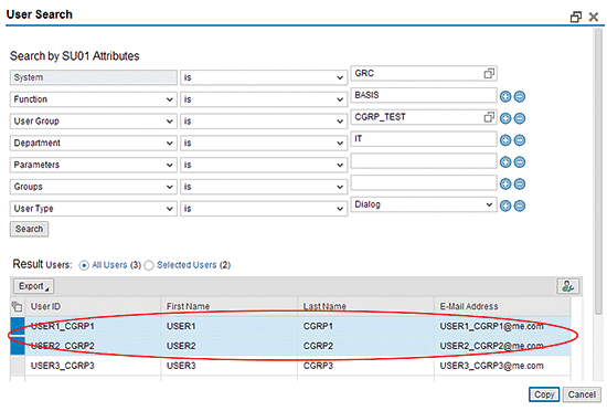 You can view the search results based on selection criteria for SU01 attributes in the next screen (Figure 20). Highlight the users you want to consider in the variant. The numbering in the Selected Users radio button changes. In my example the Selected Users number is now 2. Click the Copy button.