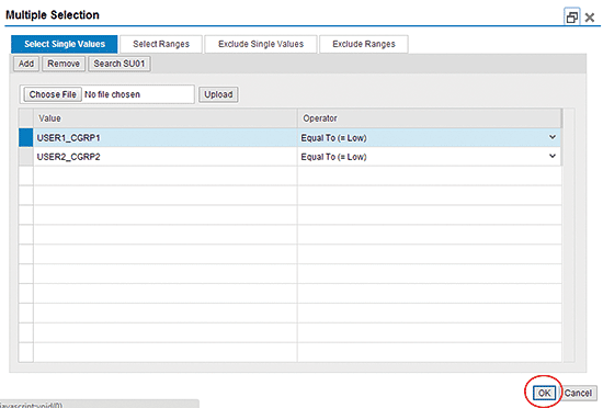 In the next screen populate the fields as shown in Figure 17. In the User row choose Multiple Selections from the pull-down list of options and then click the Add Selections button.