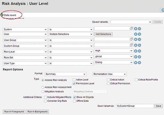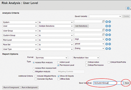 A variant allows a user to define user-specific criteria that can be used to run reports repeatedly without having to define the selection criteria every time the report is needed. Simply select the saved criteria (in the form of a saved variant). This offers the end users the ability to personalize their risk reporting options without necessarily having access to the administrator-controlled custom user groups.