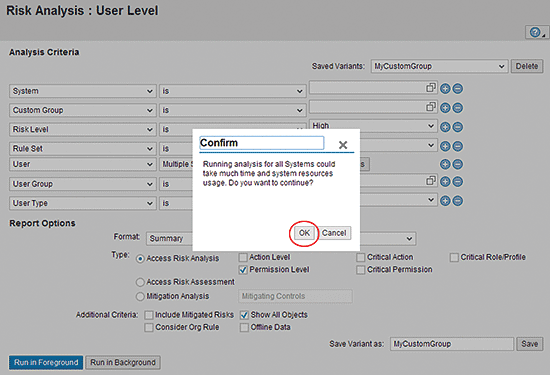 Click the Run in Foreground button to run risk analysis based on the defined user attributes. In the next screen a dialog box appears asking you to continue the risk analysis. Click the OK button (Figure 9).