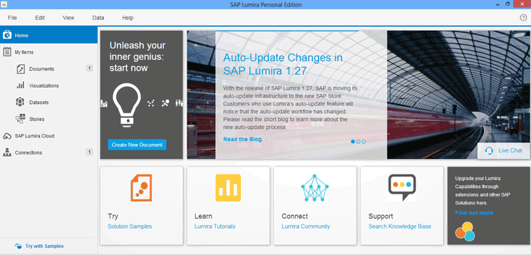 and double-click it. After you launch SAP Lumira, you are taken to the home page. Because SAP Lumira is a rapidly evolving product, the home page may look different from the one shown in Figure 1.