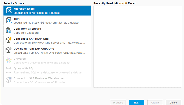 Your next activity is to extract data from the source and move it to the target. In this case, the source is the Excel spreadsheet, and the target is SAP Lumira. To extract the data from the source, click File in the main menu of Figure 1 and then click New in the list of options in the sub-menu. You now can select the type of data you want to extract from the screen shown in Figure 2.