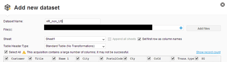 In the File(s) field of Figure 3, enter a descriptive name for the dataset (I blanked out the file name to hide sensitive information). You see the entire path in this field. Notice that SAP Lumira pulls in all the metadata as well as the entire dataset. This extract has a lot of columns (387 to be precise), and you can get this information by clicking the Show record count link on the right.