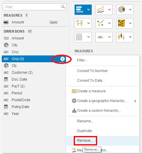Notice that some of the field names sound technical and are abbreviated. As a business user, you would probably prefer to analyze data based on field names that correspond closely to the way you transact business. Some cleaning up can be done. It’s very easy in SAP Lumira. Let’s take the Crcy (3) field (Figure 4) as an example. You may want to remove it completely from your visualization since you already have a local currency field. Highlight the field and click the options icon