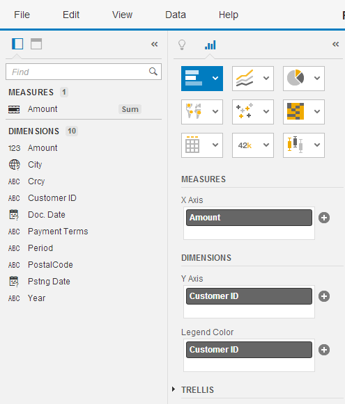 SAP Lumira organizes all the attributes and puts them in the Dimensions bucket and puts all the numeric fields into the Measures bucket. I have used customer IDs intentionally instead of customer names in order to mask sensitive data. In the actual POC, I used customer names—that’s obviously a much more efficient analytical technique.