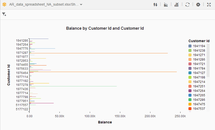 With this kind of visual at your disposal, you can make some immediate conclusions. Period 10 of 2014 has the largest outstanding balance. The next logical step for you would be to do some more analysis. On the right corner of the screen in Figure 8, you see a bunch of icons. As you mouse over, the purposes of each are displayed. In this case, the first two are relevant. You can click the first icon (the up and down arrows) to sort by dimensions and click the second (rank) icon