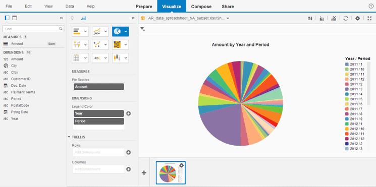 After you select your fields (e.g., Customer ID, Amount, City, Local currency), click the Create button (not shown) at the bottom of the screen in Figure 3. You are now in the Prepare tab of SAP Lumira. For this prototype, there isn’t anything I would recommend you do on this view, so you can click another tab (e.g., Visualize).