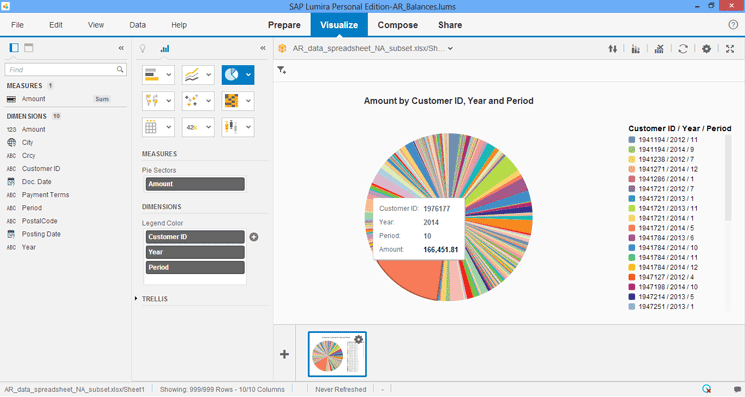 Now suppose you want to add the customer dimension to your pie chart to analyze which of your customers had the highest outstanding balances during a certain period of a particular year. In this case, all you need to do is to click the + icon under Dimensions in Figure 8 and select the Customer ID dimension to be added. A new pie chart is generated, and as you mouse over this chart, you immediately know that customer 1976177 was the biggest violator in period 10 of 2014 with an outstanding balance of approximately $166,000. This is shown in Figure 9.