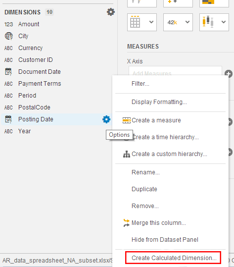 Now go back to the Visualize tab in SAP Lumira in Figure 9, place your cursor in the Posting Date field, and click the options icon. In the context menu, click the Create Calculated Dimension… option as shown in Figure 12.