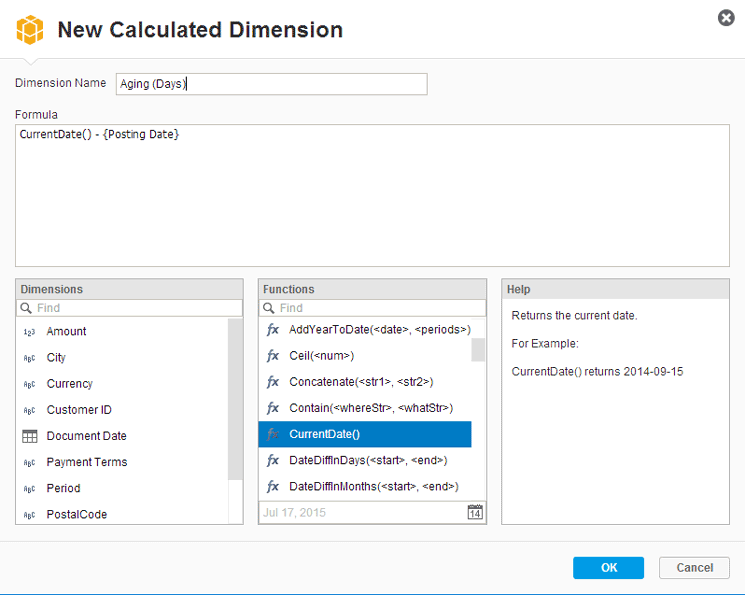 After you click this option, a screen appears in which you can use a variety of functions and operators that you then assign to your calculated dimension (Figure 13).