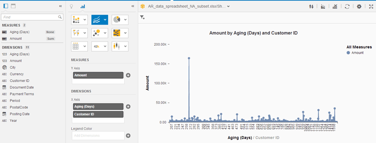 The flexibility of SAP Lumira allows you to experiment and learn by trial and error. In a more traditional and rigid application, such experiments cannot be done on the fly and making changes would be time-consuming. For example, if you want to use aging as a dimension instead as a measure, and display elapsed days exactly as they are, select Aging (Days) from your list of dimensions instead of measures. This time, use a line chart and select measures (Amount) and dimensions (Aging (Days) and Customer ID) as shown in Figure 16.