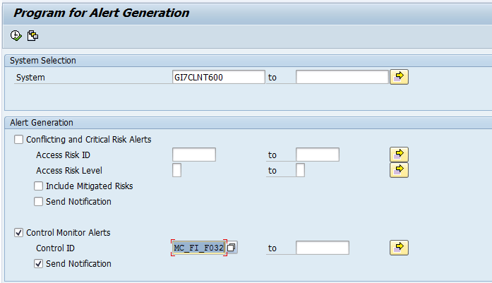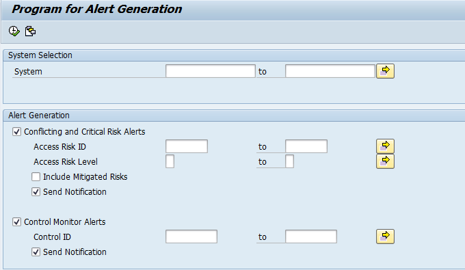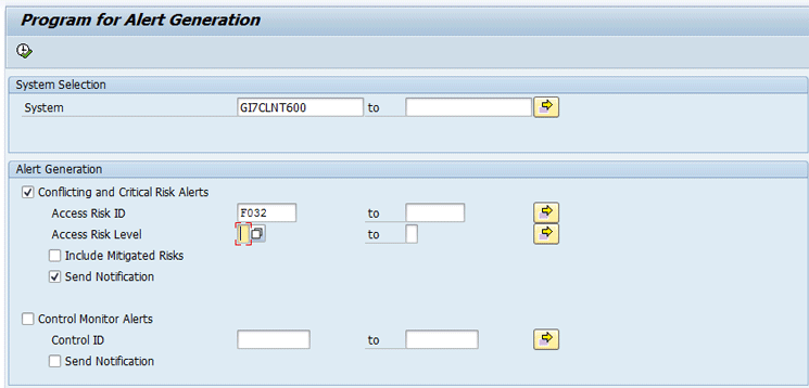 - IMG menu path Governance, Risk and Compliance > Access Control > Access Risk Analysis > Generate Alerts