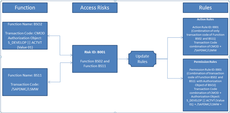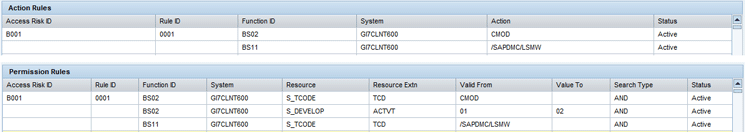 Scenario 1 uses the action rules and permission rules concept for the access risk. A rule defines a combination of transactions that if executed by one user can lead to fraud.